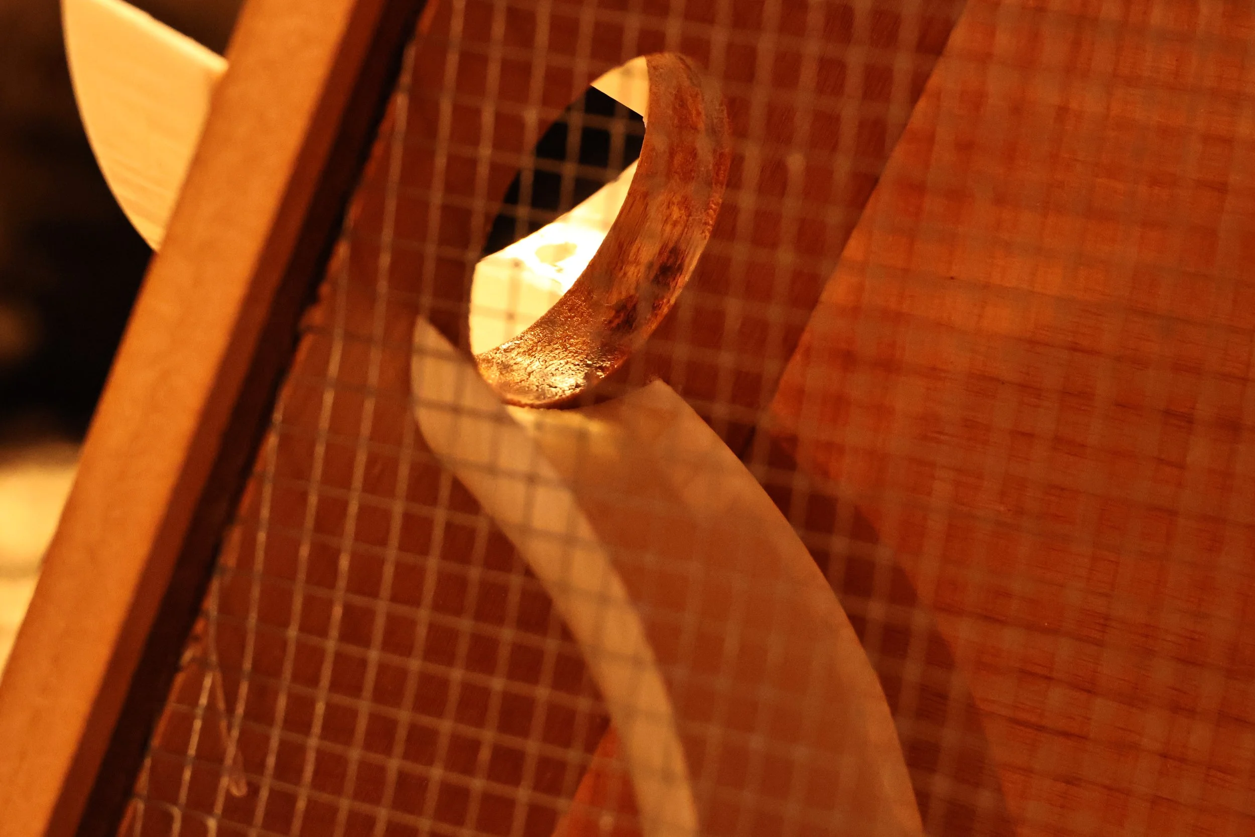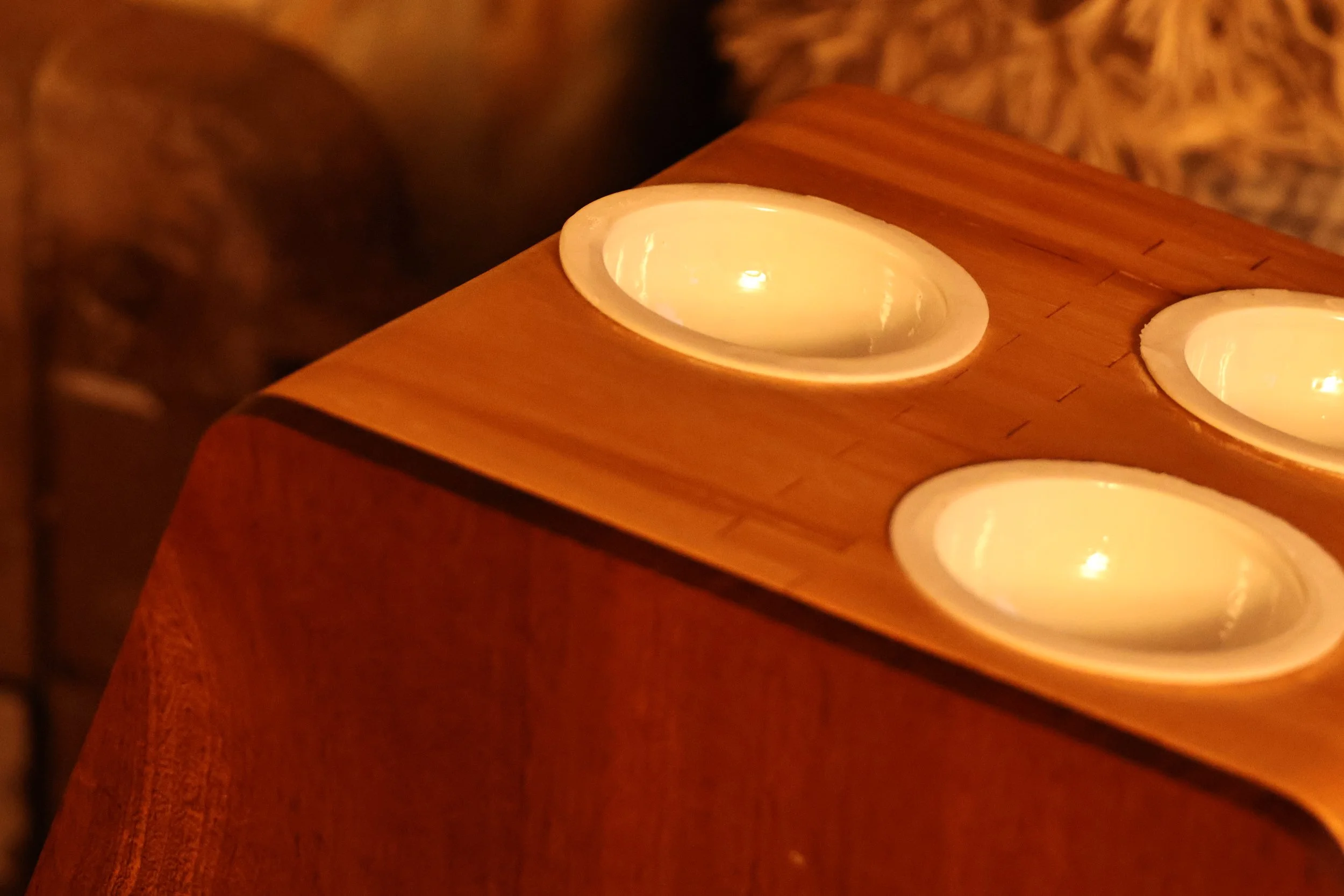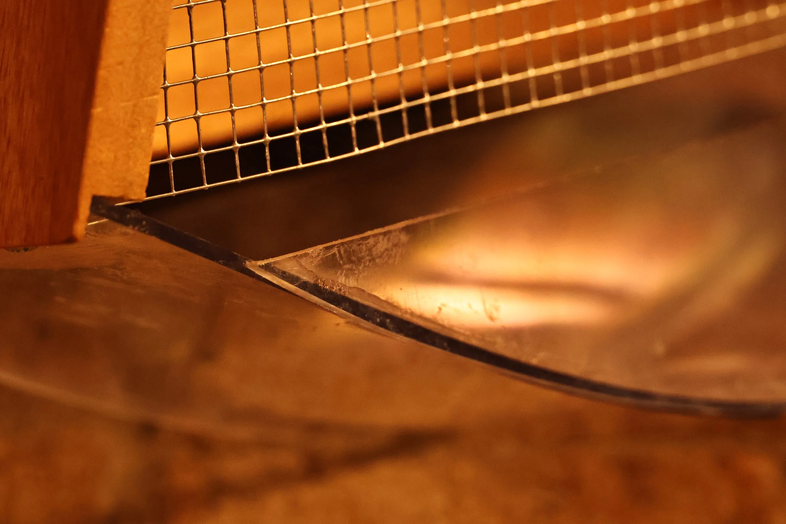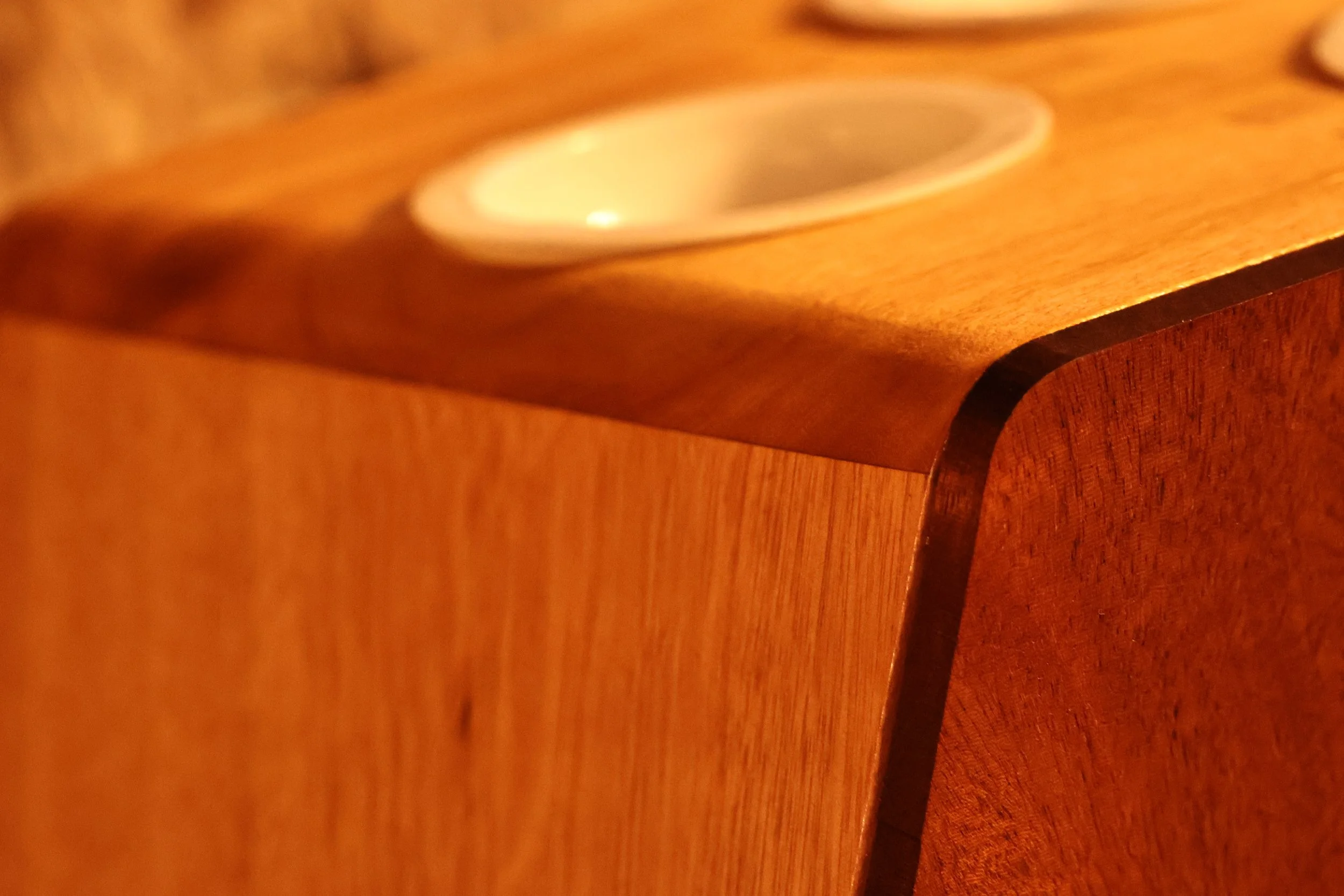 Final additions: 3D-printed bowls to catch and hold water (coated with epoxy) and rain catchers at each entrance. Additionally, the same waterproof finish was added to the front sapele cover.