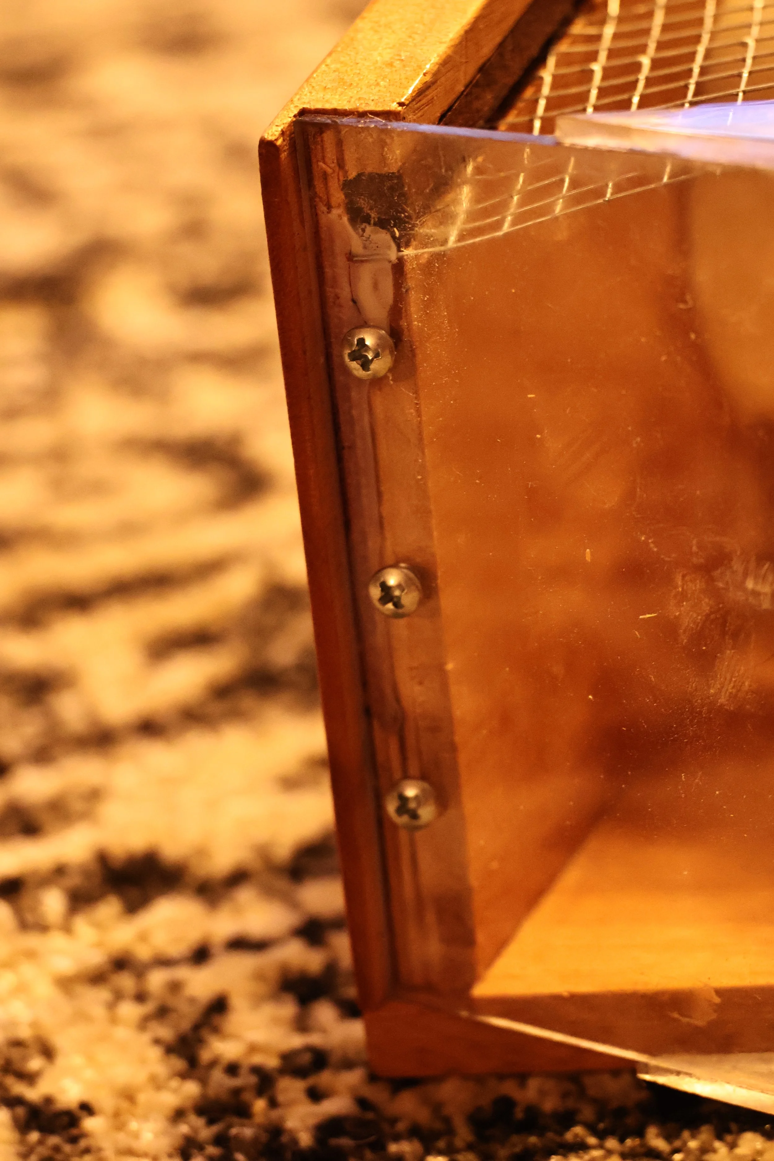 Right: Mid-fidelity model made from plywood. This model contains many features that remain consistent into the final model, including placement of entrances, nesting area size, inner perch/ platform size, wire mesh cover, and wood cover shape and size.
