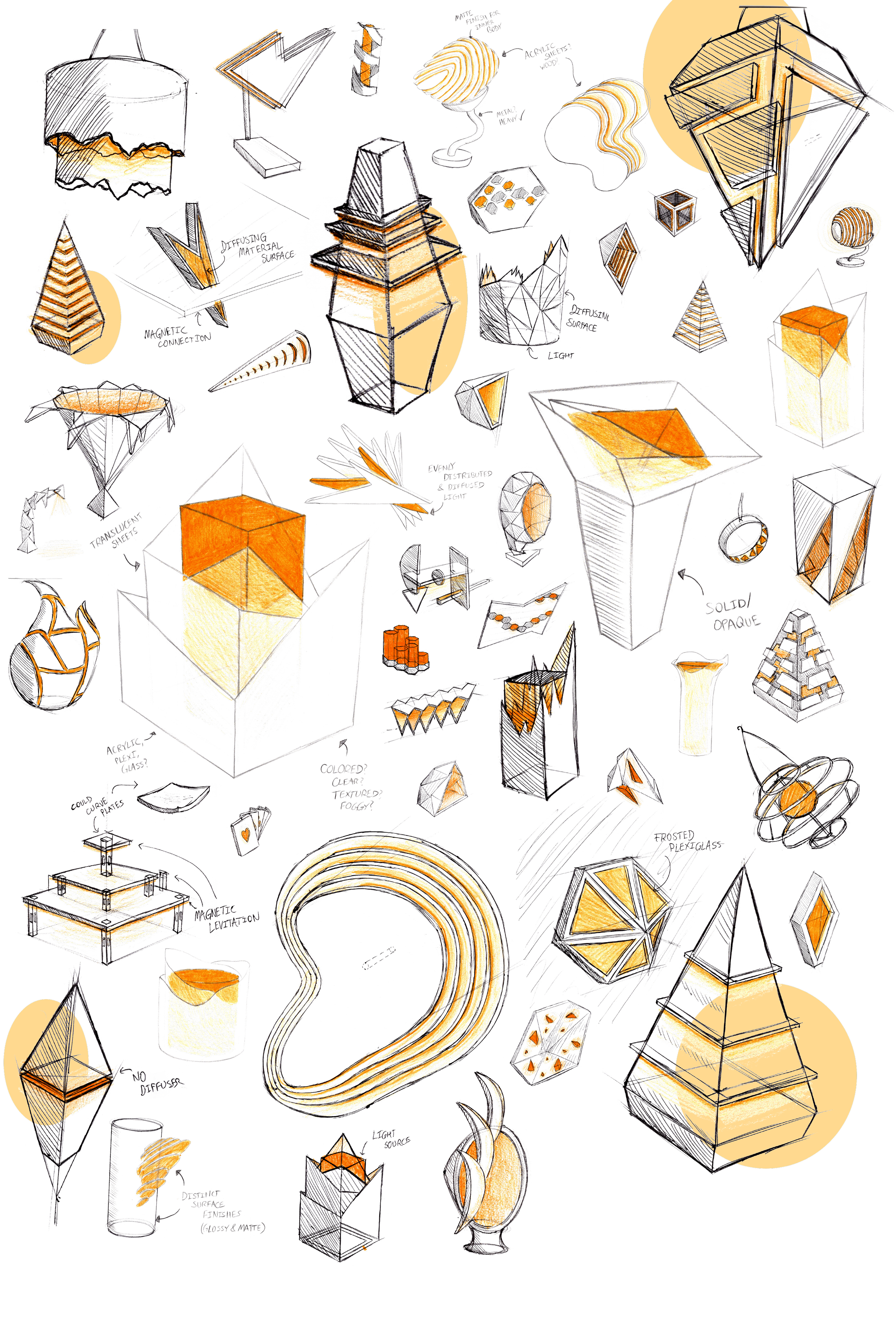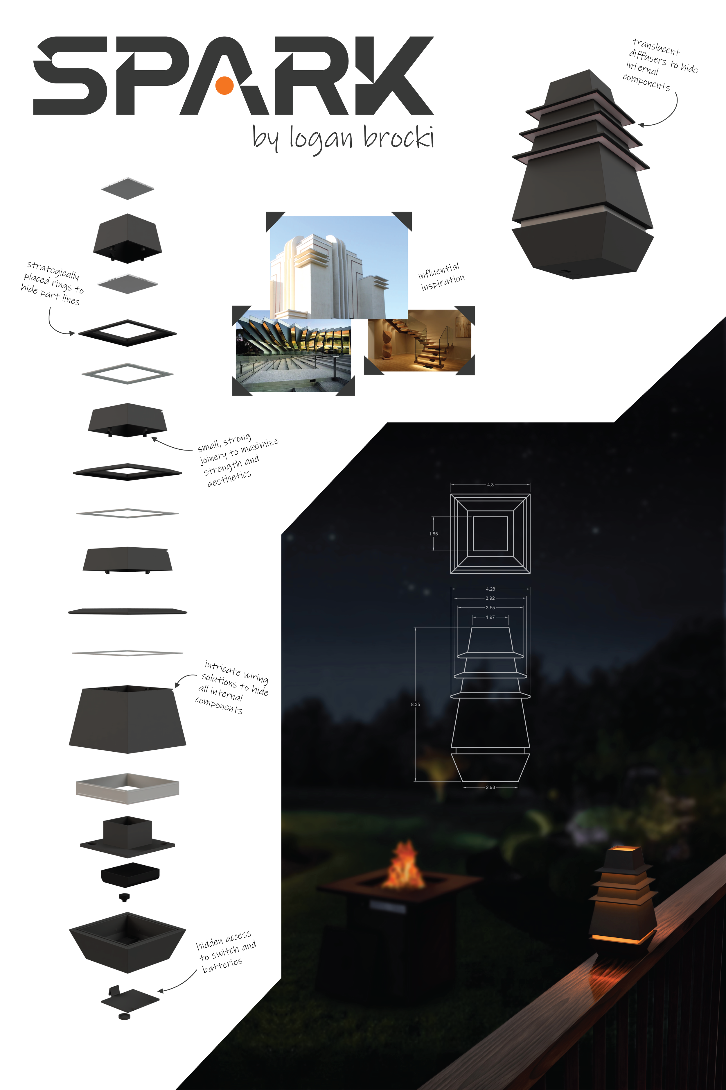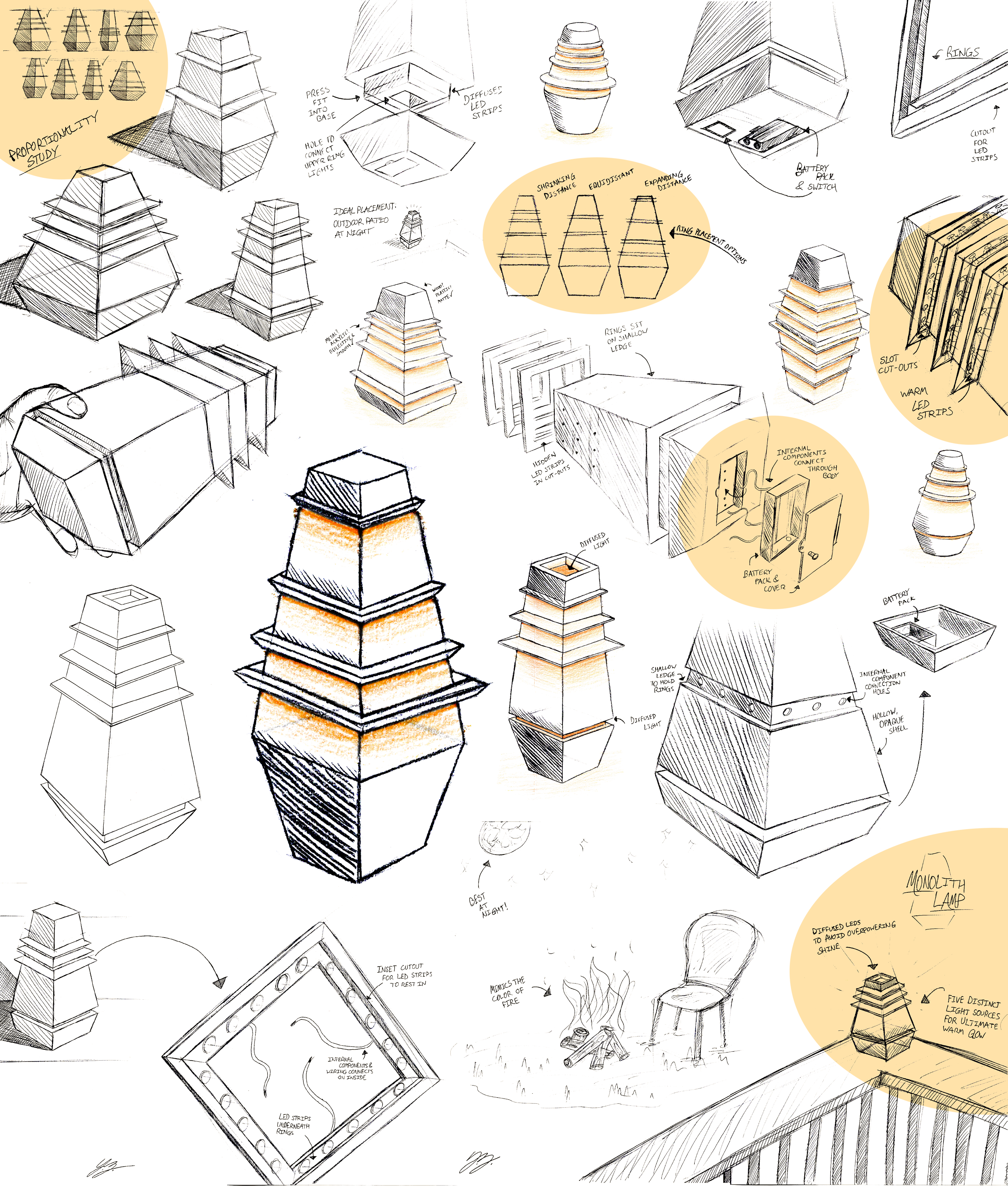 Based on the inspiration boards I created at the beginning of the ideation process, I knew I wanted to create a lamp that blended a sharp and architectural exterior with a warm glow that mimicked the temperature of fire. My vision was that this lamp could be placed in an outdoor patio area and extend the warmth of a nearby fire.