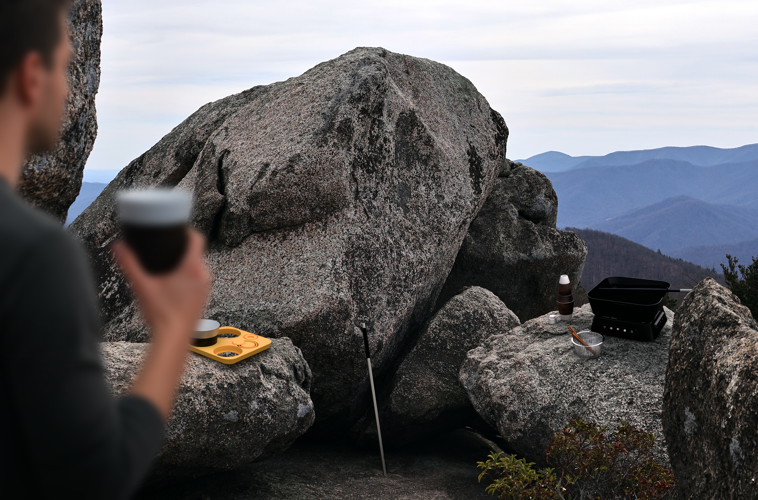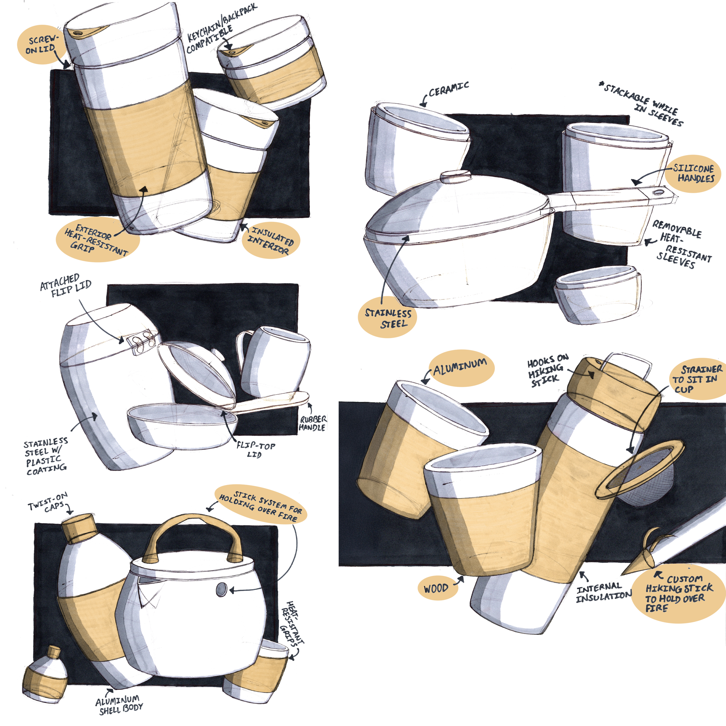 A few details I focused on during the design process were the texture and color of materials, overall product weight, compactness, and ease of use. I desired a functional, aesthetic, and usable tea set that could serve multiple purposes on a long and vertical hike.