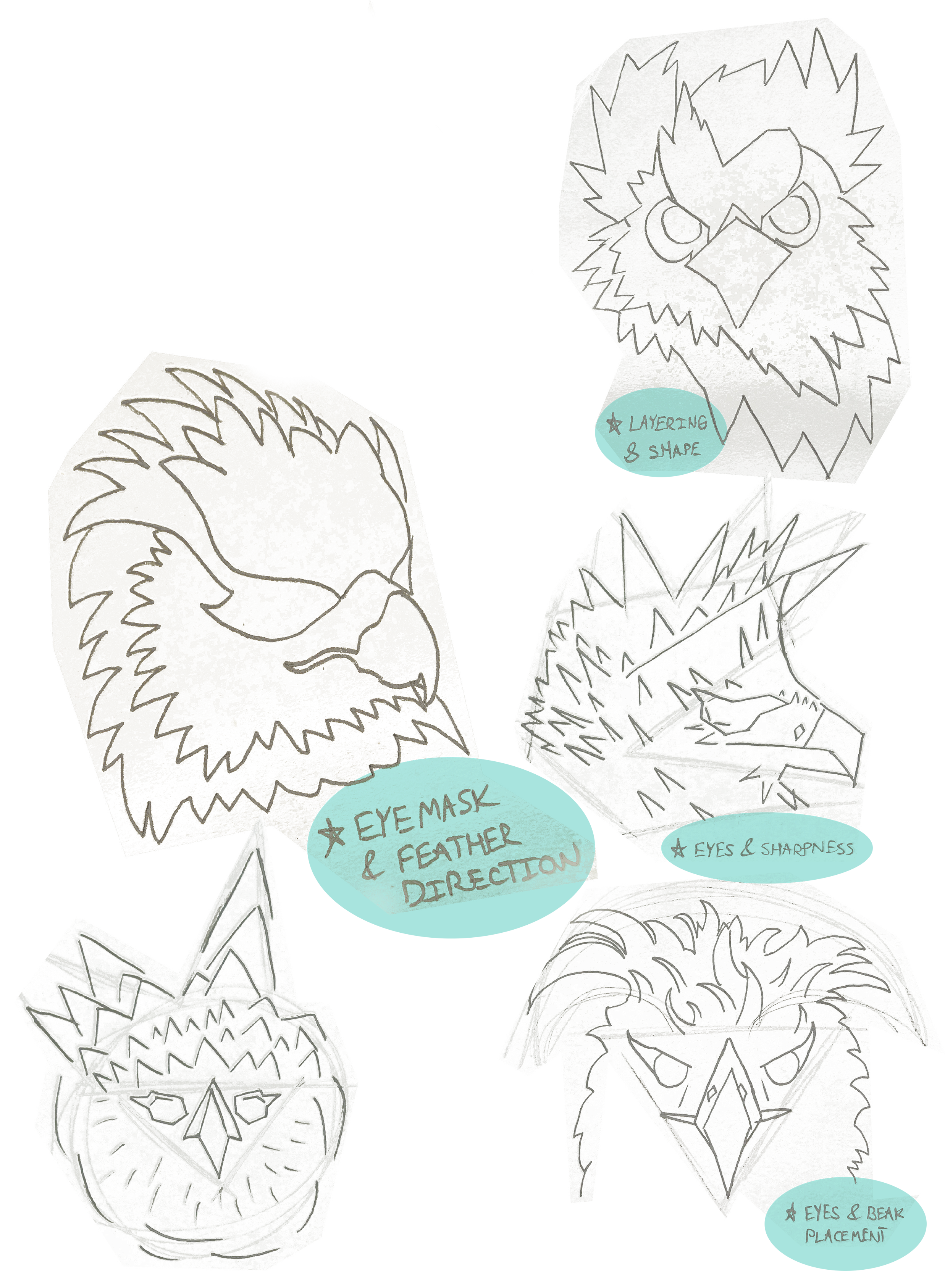 The next iterations were focused on finding the perfect fit, sizing and shaping the beak, and choosing the feather design